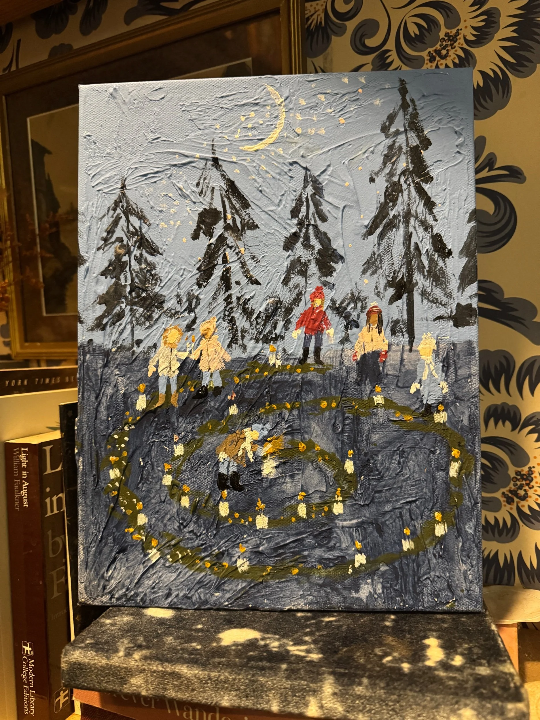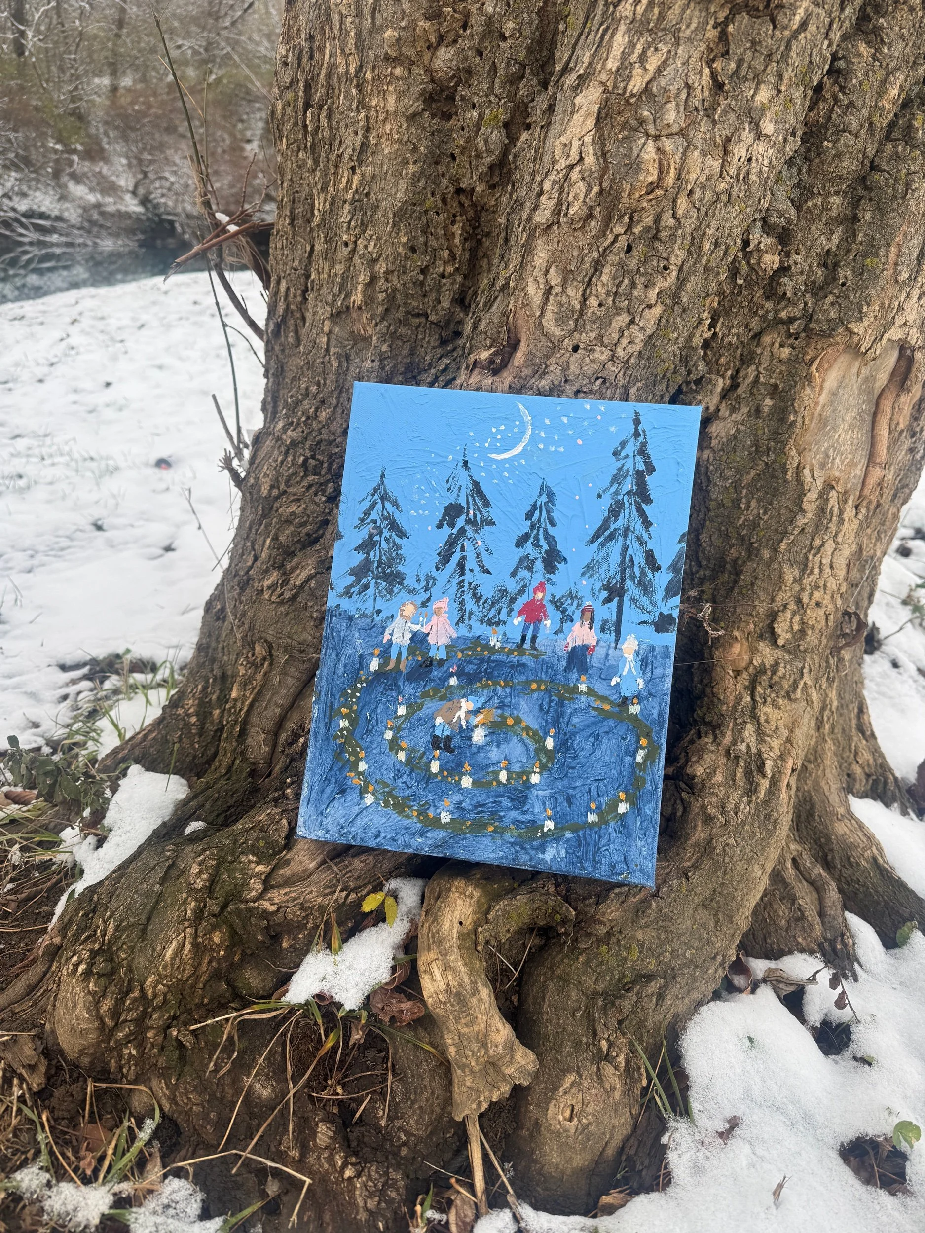 Part of my 2025 holiday collection “Solstice Stories” celebrating the ways we find warmth and light during the darkest night, this piece is painting on 9x12” gallery-wrapped canvas and depicts a beloved ritual of walking the solstice spiral to reflect on the previous year and bring light into the year to come.